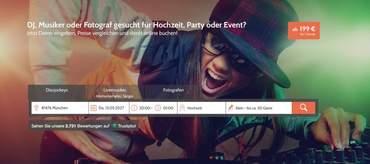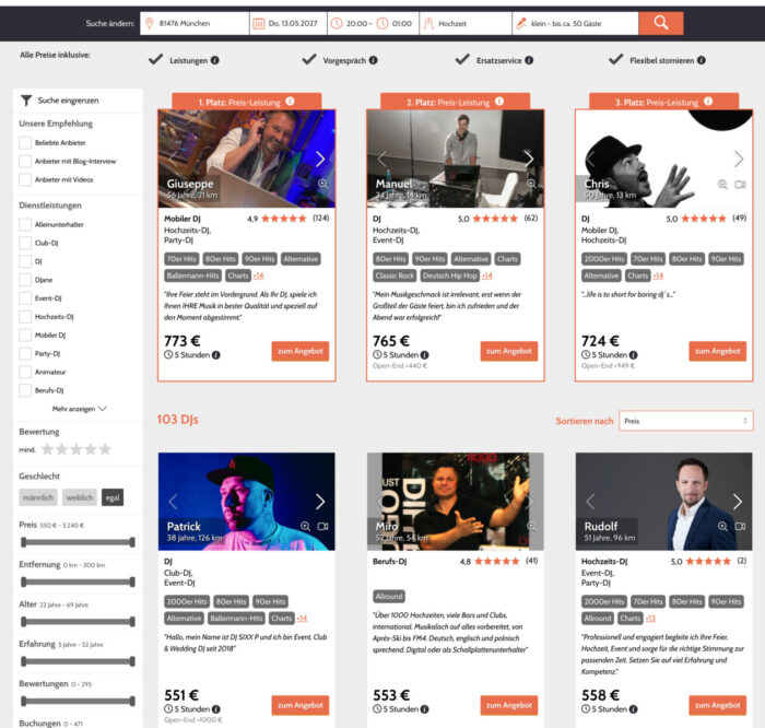 Die Sortierung der Dienstleister könnt ihr zusätzlich individuell nach Preis, Entfernung, Bewertung usw. einstellen. Zu jedem Anbieter findet ihr außerdem ein ausführliches Profil mit Bildern, detaillierten Beschreibungen wie Musik-Schwerpunkte, Erfahrungen und eine Kurzvorstellung. Auch Kunden-Bewertungen von vergangenen Veranstaltungen könnt ihr auf dieser Seite sehen. Gerade Kunden-Bewertungen vermitteln euch ein gutes und unabhängiges Bild über die Leistung des Dienstleisters.