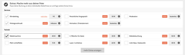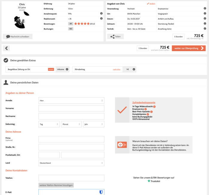 Sobald ihr euch für einen DJ, Musiker oder Fotografen entschieden habt, könnt ihr ihn oder sie direkt über die Profilseite buchen. Hier könnt ihr bei vielen Anbietern auch noch zahlreiche Extras hinzufügen, ganz nach euren Wünschen.