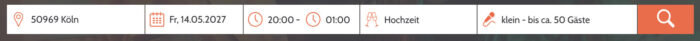Auf EVELY.com gebt ihr im Suchfeld zunächst die wichtigsten Daten zur anstehenden Veranstaltung ein: Ort, Datum, Uhrzeit, Art der Veranstaltung, Anzahl der Gäste und die gewünschte Technik.