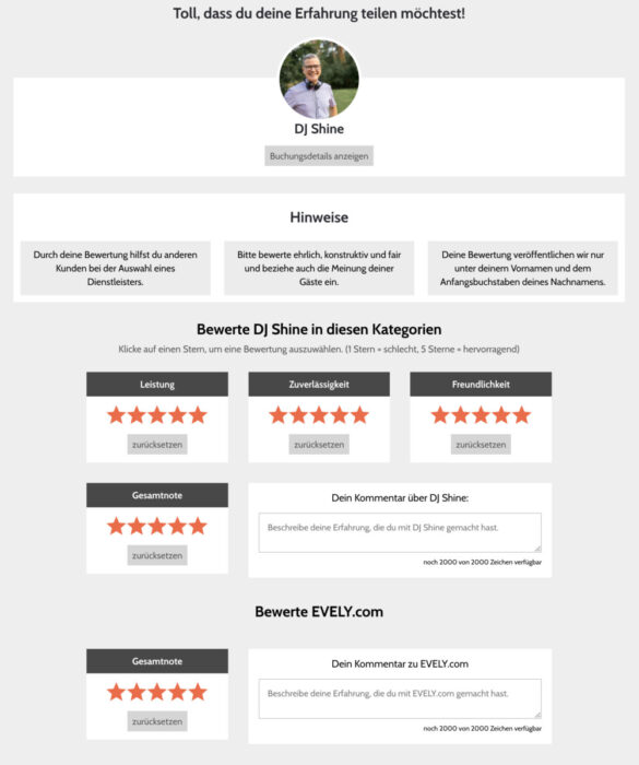 Sofern nicht anders vereinbart, erwartet der Dienstleister den Komplettpreis erst am Tag der Veranstaltung von euch in bar. Einen Tag nach Durchführung eurer Veranstaltung erhaltet ihr noch eine Einladung per E-Mail, über die ihr die Leistung eures Dienstleisters bewerten könnt.