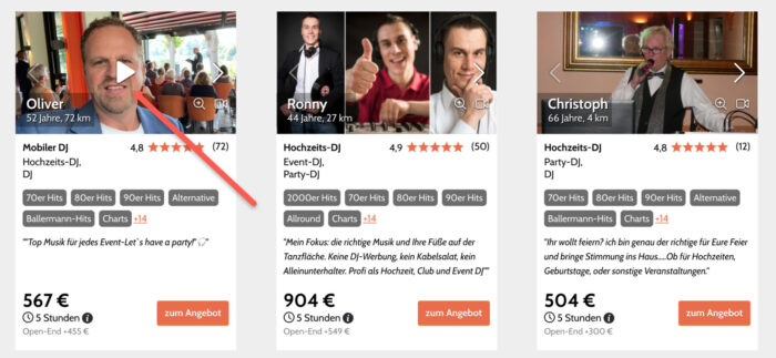Viele unserer Anbieter haben es bereits in ihrem Profil, alle anderen sind gerade fleißig dabei, es aufzunehmen: ein Video, in dem sie sich kurz vorstellen, erzählen, was das Besondere an ihnen als Dienstleister ist, wie sie zur perfekten Veranstaltung beitragen und welche Musik sie spielen. Außerdem verraten sie darin die besten Tipps, worauf man bei der Wahl am besten achten sollte. Dank dieses Videos ist es also fast so, als würde man den Eventler persönlich treffen, um sich ein Bild von ihm zu machen und hinterher entscheiden zu können, ob er der Richtige ist.
