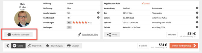 Viele DJs bieten zu einem Standard-Licht- und Tonequipment optional weitere Technik als Extras an, z. B. eine Nebelmaschine, Karaokeanlage, Dekobeleuchtung usw. Die Extras könnt ihr bei der Buchung in wenigen Sekunden dazubuchen. Die Preise sind auch hier immer transparent aufgeschlüsselt und werden nach der Auswahl zum Gesamtpreis addiert. Sollten Fragen zu den Extras oder der DJ-Technik allgemein aufkommen, gibt es für euch immer die Möglichkeit, vor einer Buchung Kontakt zum Wunsch-DJ aufzunehmen. Wählt dazu einfach die Frage-Funktion “Nachricht schreiben” im DJ-Profil.