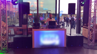 - DJ Tisch: mit weißem Cover (ADJ Event Table ii) mit LED Leiste, damit der DJ Tisch in bunten Farben erstrahlt