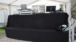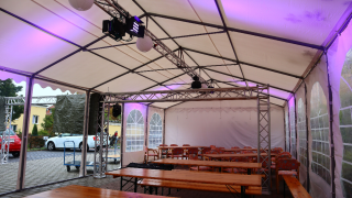 Ich besitze zwei Festzelte. Ein 5 × 5 m Zelt, was ich für Open Air feste als Schutzzelt benutze, um Bühne, Licht und Tontechnik vor Wetter zu schützen und damit ich nicht nass werde. Dazu besitze ich, ein 6 × 12 m großes Festzelt mit 3,80 m Firsthöhe für ca. 144 Gäste tanzend, 103 Personen aufgereiht in Stühlen, oder 64 Sitzplätze an Rundtischen.